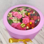 Альстромерия – 3 шт.Клубника – 300 гр.Коробка шляпная – 1 шт.Фисташка – 3 шт.орехи в глазури – 10 шт.кустовые розы – 10 шт.макааруни – 4 шт.