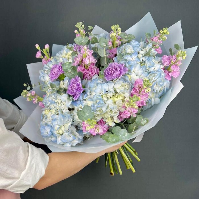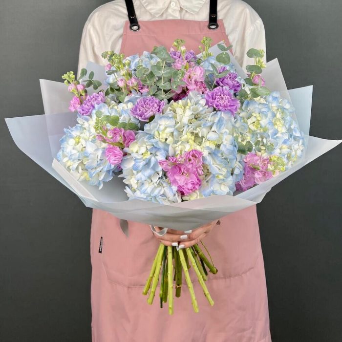 Авторский букет голубая Гортензия и ароматная Маттиола