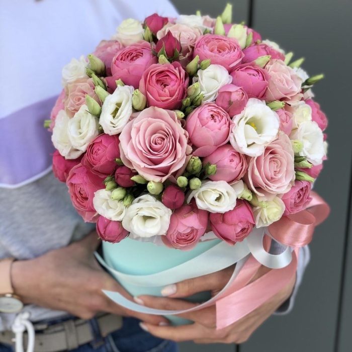 Сильвия – 12 шт. эустома белая – 5 шт. пинк мондиаль – 8 шт. Коробка шляпная – 1 шт. Оазис – 1 шт. Оформление лента – 1 шт.