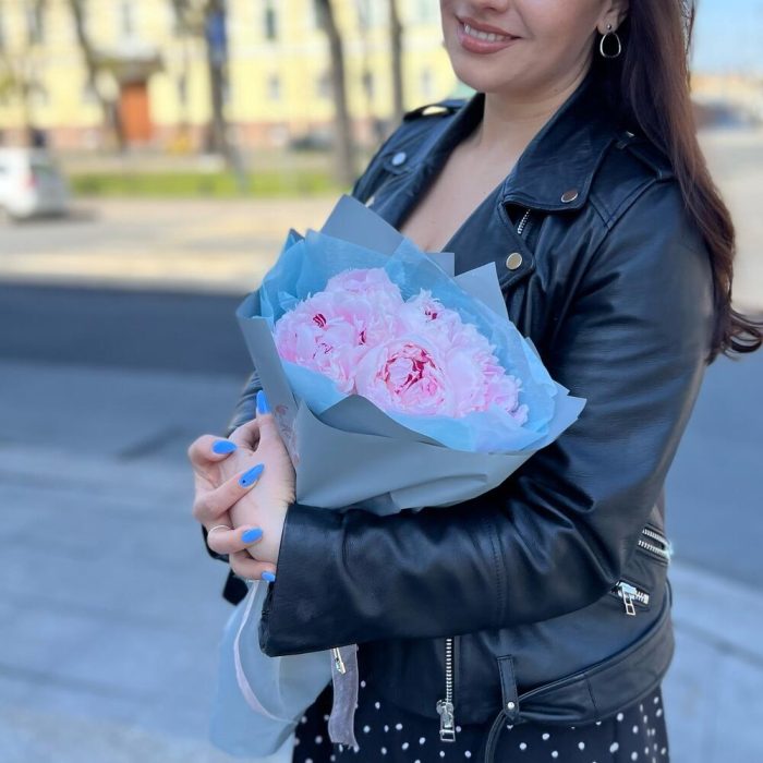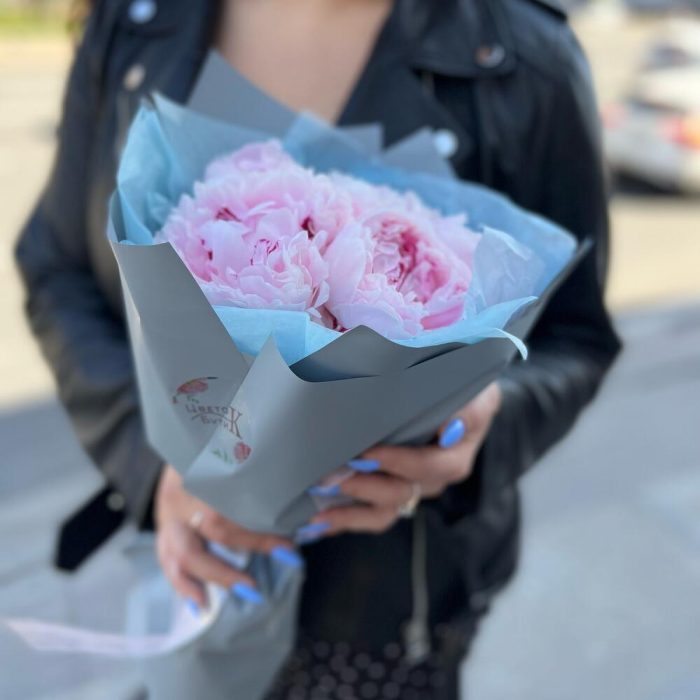 Пион Сара Бернар – 5 шт.Дизайнерская упаковка – 1 шт.Упаковка тишью – 1 шт.Атласная лента – 1 шт.крафт конверт – 1 шт.подкормка для срезанных цветов – 1 шт.инструкция по уходу за цветами – 1 шт.аквапак с водой – 1 шт.