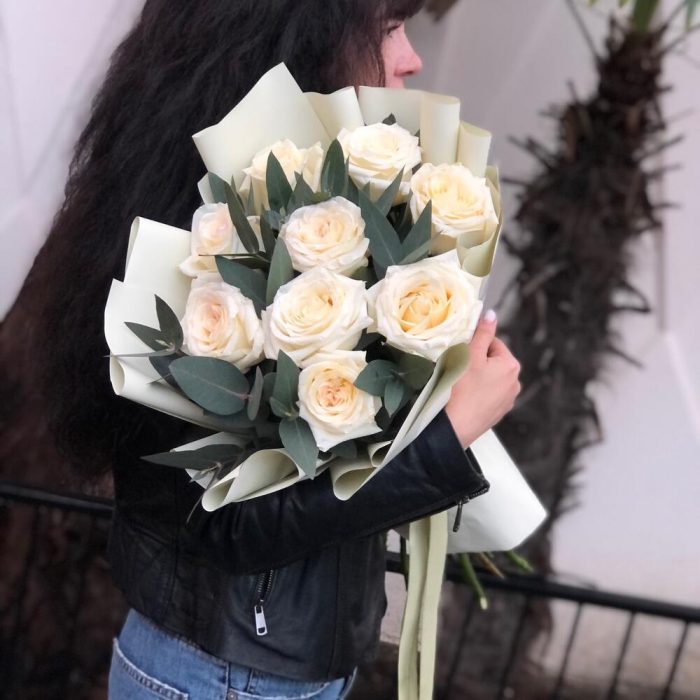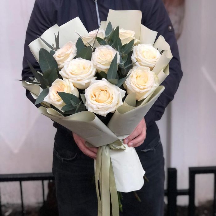 Лента – 2 шт.Эвкалипт – 4 шт.Упаковка дизайнерская – 1 шт.Роза белая эквадор – 9 шт.